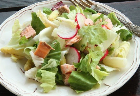 Insalata con asparagi, salmone e ravanelli. Leggera, sana e ideale per il pranzo primaverile.