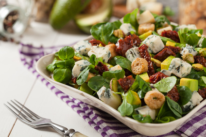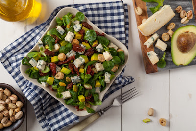 Insalata con valerianella, avocado, gorgonzola e pomodori secchi. Servita con un’aggiunta di crostini e pistacchi salati. È ideale per un pranzo o una cena quando fa tanto caldo e cucinare al forno non è una buona idea. L’insalata è buonissima e veloce da preparare. Provatela!