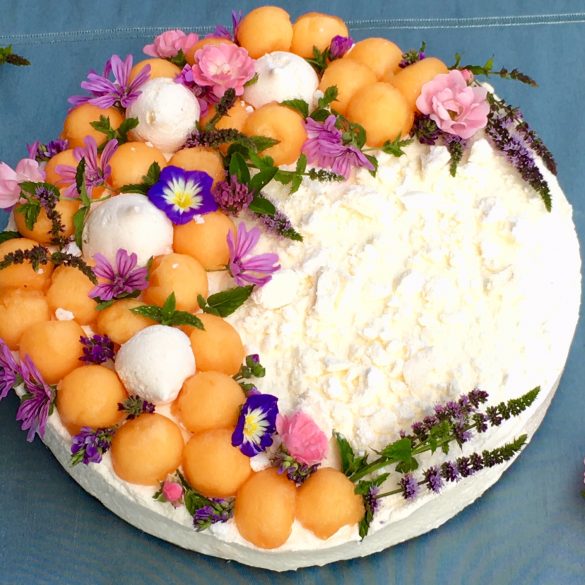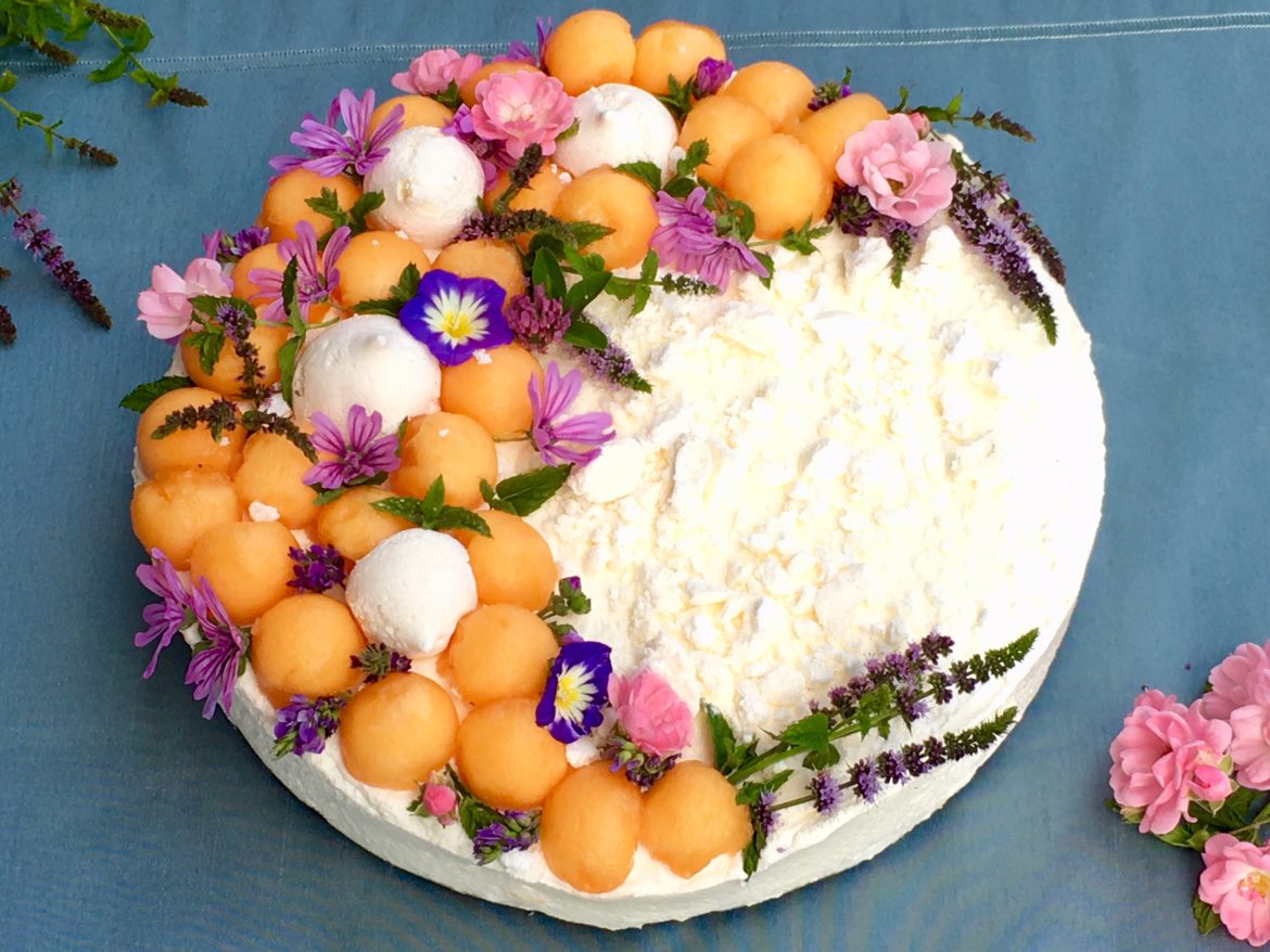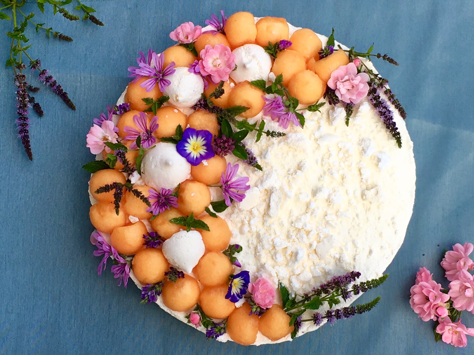 Prima di servire il dolce, decoratelo con la panna montata, il melone (a pezzi o, se avete lo strumento adatto, a palline), la menta e i fiori.
