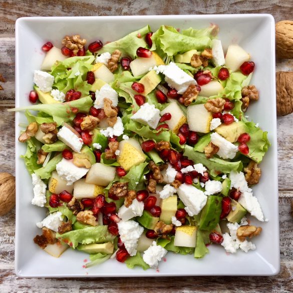 Insalata con pera, melagrana, avocado, noci e ricotta di pecora condita con un delizioso dressing… 2 manciate di lattughino o rucola Mettete in una tazzina tutti gli ingredienti utili alla preparazione del dressing e mescolateli bene. Buon appetito!