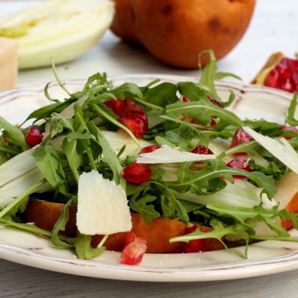 Insalata con rucola, finocchio, pera e melagrana. Buonissima, leggera e sana. La melagrana contiene tanti antiossidanti e supporta il sistema immunitario; è consigliata per abbassare il livello di colesterolo. Anche la pera ha effetti anticoloresterolemici e sopratutto contiene le vitamine A, C, B1, B2 e B3 e sali minerali come: potassio, calcio, fosforo, ferro, zinco, magnesio. Quindi tanta salute in un piatto. Ve la consiglio!