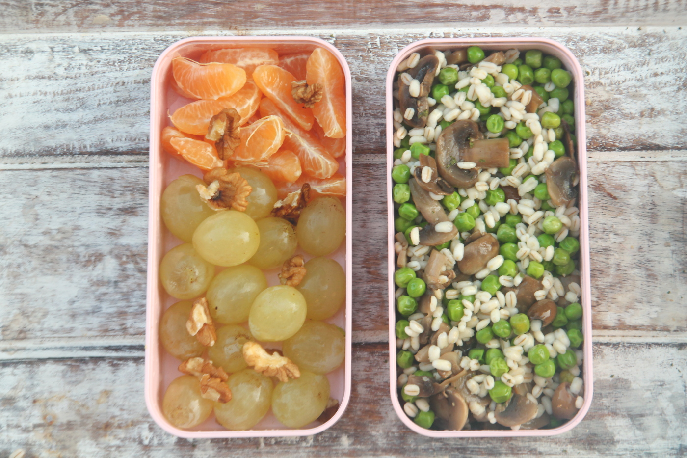 Il pranzo di venerdì: orzo con funghi champignon e piselli. La ricetta è qui. Questo piatto si può mangiare freddo o caldo, come preferite. Per la merenda abbiamo avuto mandarino, uva bianca e qualche noce.