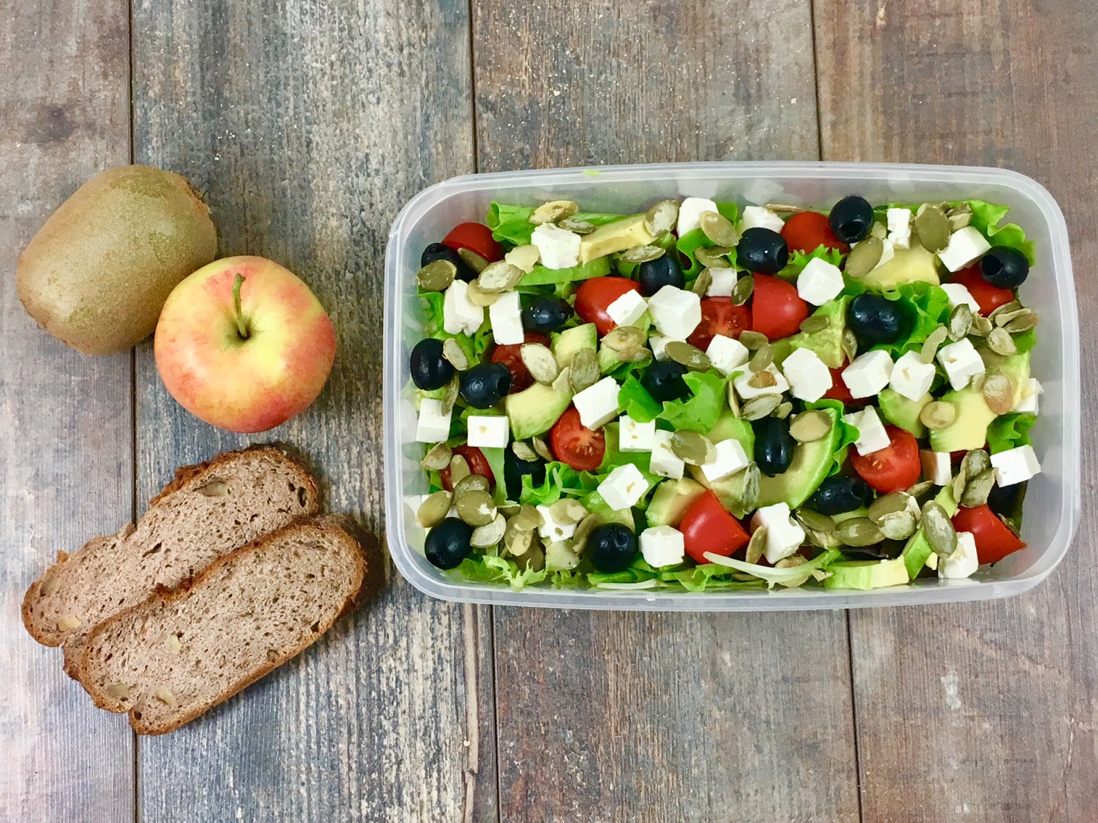 Il pranzo di lunedì l’ho preparato in 10 minuti. Abbiamo mangiato: un’insalata con avocado, pomodorini, olive nere, feta e semi di zucca. Accompagnano 2 fette di pane di grano saraceno e frutta fresca.