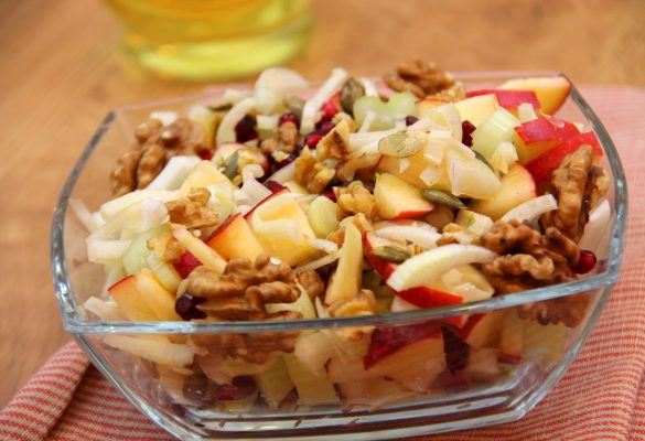 Insalata di mela, sedano e finocchio, con semi di melagrana e una piccola aggiunta di noci e semi di zucca. Croccante, leggera e nutriente. Ideale per un pranzo quotidiano, ma anche come contorno per un pranzo festivo.