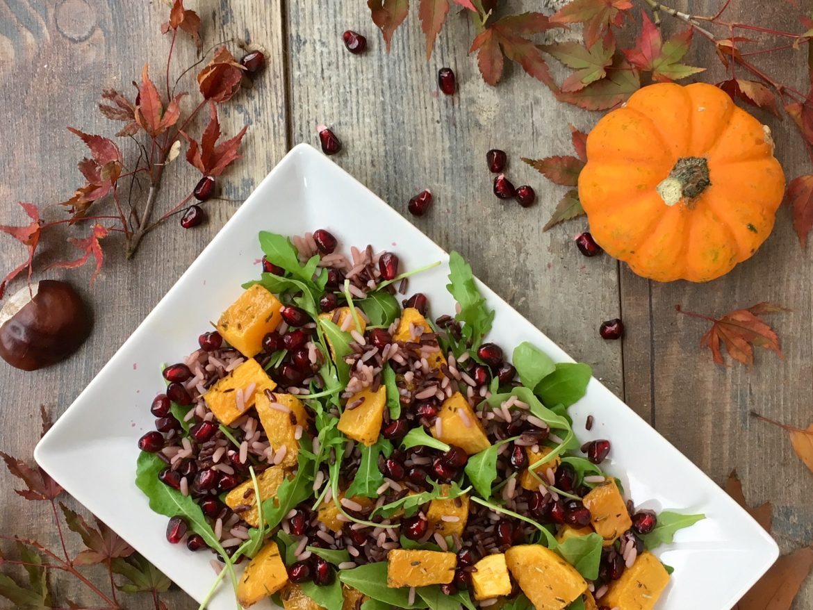 Insalata di zucca, rucola, riso e melagrana