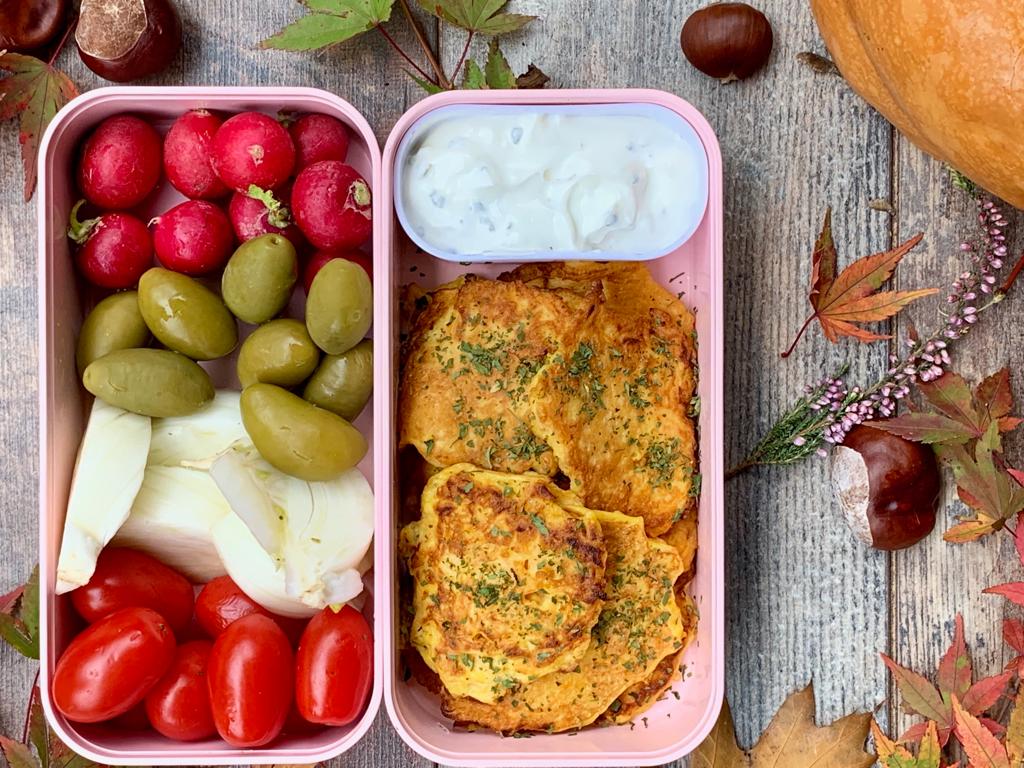 Lunedì abbiamo mangiato buonissime frittelle di zucca con la salsa di yogurt e aglio (la ricetta è qui) e cosparse con prezzemolo. Accompagnano le verdure fresche.