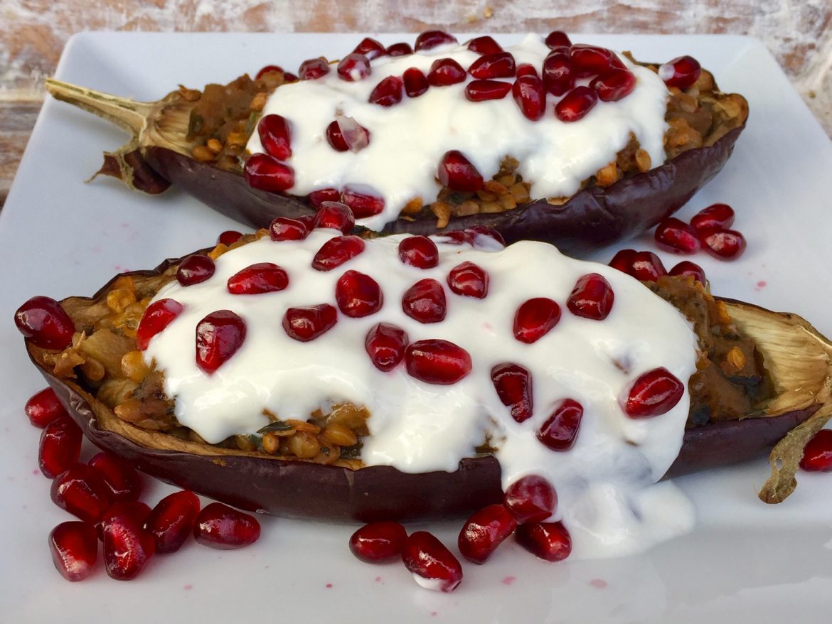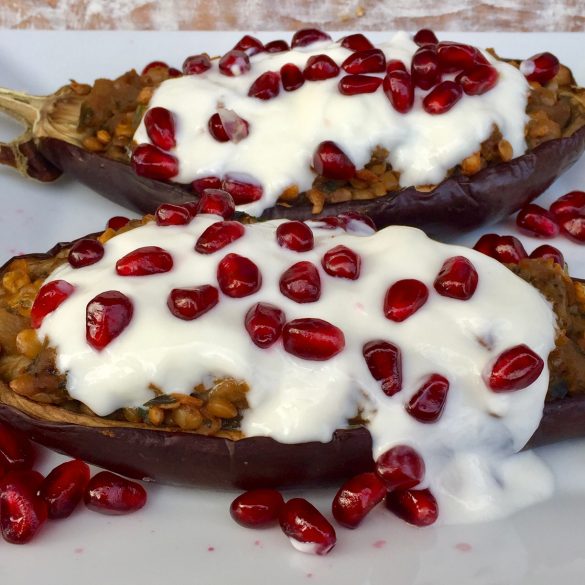 Melanzane ripiene di lenticchie e servite con yogurt e semi di melagrana. Un piatto ideale per una cena leggera. Buono, abbondante e sano. Se volete un piatto vegano, potete fare una salsa di tahini anziché usare lo yogurt.