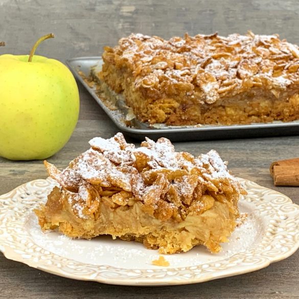 La torta di corn flakes e mele è un dolce davvero speciale. Vegano, senza glutine, lattosio e senza uova. Un dolce buonissimo, facile e veloce da preparare. Croccante in superficie e soffice dentro, con un buonissimo profumo di cannella. Ideale per tutti coloro che soffrono di intolleranze, ma non solo. Buonissima servita calda con gelato… Ve la consiglio tanto! farcitura: Una volta pronta, cospargete la vostra torta con lo zucchero a velo e servitela calda.