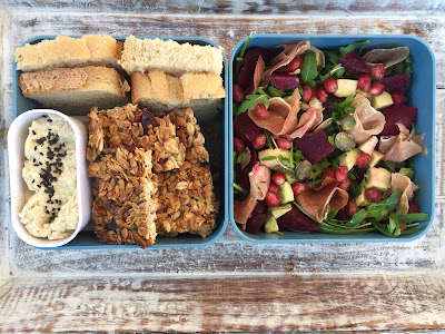 Lunedì era una giornata lunga, allora la nostra schiscettta era più abbondante. Abbiamo mangiato un’insalata composta da: rucola, avocado, barbabietola cotta, prosciutto crudo, semi di melagrana e semi di zucca. Prima di mangiare, l’ho condita con crema di aceto balsamico e un po’ di olio. Accompagnano il pane fatto in casa e hummus (la ricetta qui). Per la merenda: barrette di avena e frutta secca. La ricetta per le barrette la trovate qui.