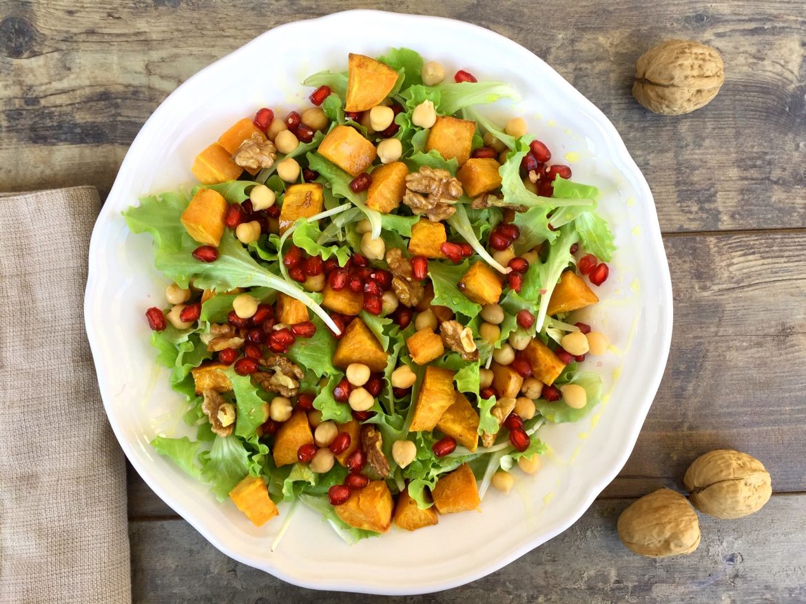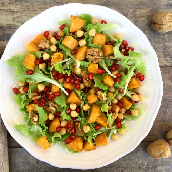 L’insalata di patate dolci, ceci e melagrana è un’idea per un pranzo gustoso e saziante. La patata dolce, cioè la “batata”, è conosciuta anche come patata americana. È un ottimo alimento antiossidante, ricco di vitamine A, B, C, E e sali minerali come potassio, magnesio, ferro e calcio. Riduce il livello del colesterolo LDL e della glicemia. Ha un sapore dolce e delicato e piace anche ai bambini. Le batate le trovate senza problemi in quasi tutti supermercati.