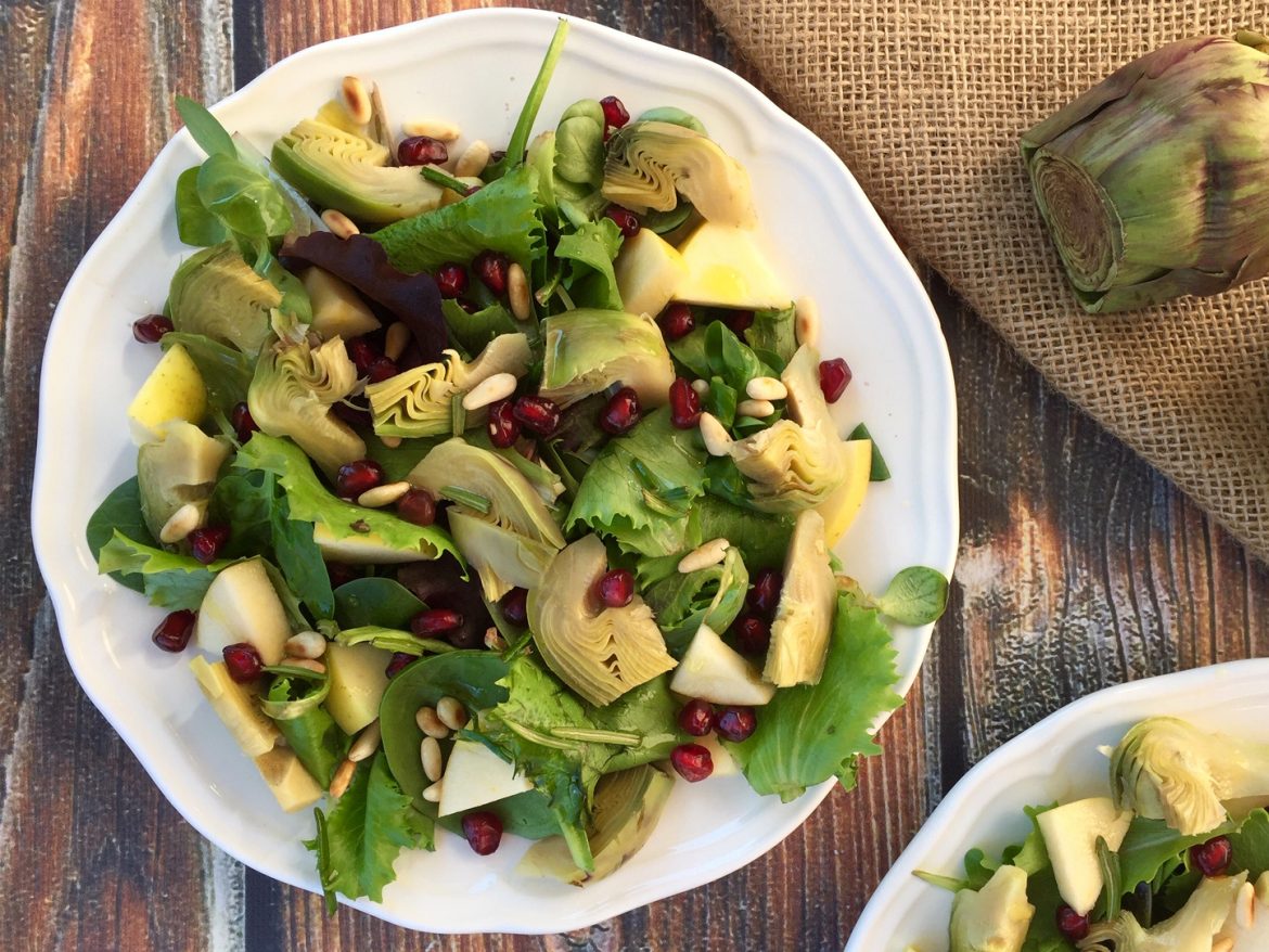 Affettate la mela e bagnate le fette con acqua e limone come avete fatto con i carciofi. In una ciotola mettete l'insalata, le fette di mela e di carciofi. Cospargete il tutto con semi di melagrana e pinoli. Filtrate l'olio al rosmarino e condite la vostra insalata. Regolate a piacere con sale e pepe.
