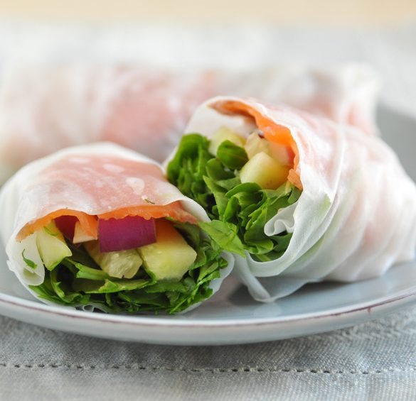 Involtini primavera ovvero verdure avvolte in fette di salmone affumicato e carta di riso. Un aperitivo o un antipasto leggero e gustoso, ideale con salse piccanti.