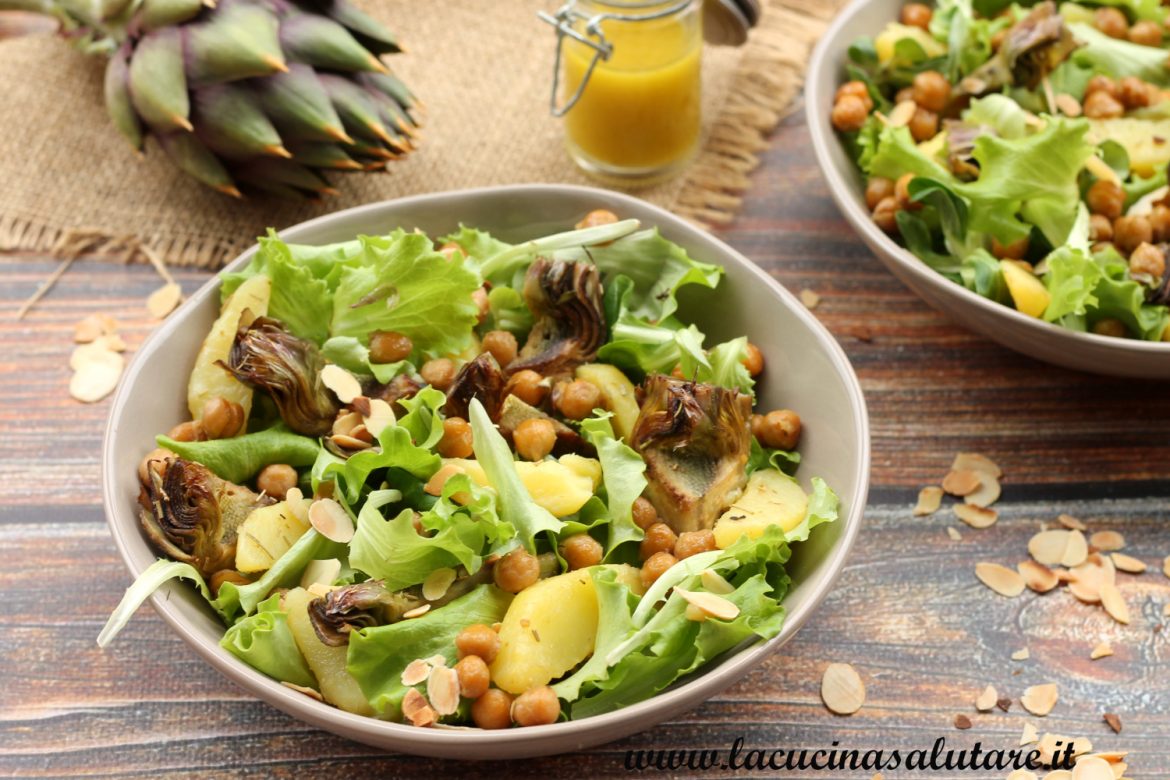 Pulite i carciofi (tagliate le foglie dure, le spine e la barba) e tagliateli in quattro. Saltateli in padella assieme ai ceci per 5 minuti con due cucchiai di olio. Tagliate le patate a spicchi e fatele bollire in acqua leggermente salata fino a quando non diventeranno morbide. Mettete il lattughino sui piatti, posate quindi le patate, il mix di carciofi e ceci e condite con la salsa francese. Cospargete infine il tutto con le mandorle, che avrete tostato leggermente in una padella asciutta.