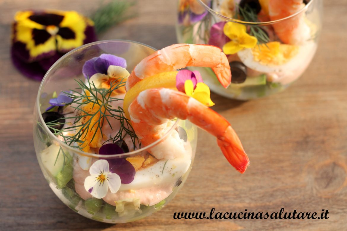 Mettete a bollire in un pentolino dell'acqua. Al momento dell'ebollizione, immergete l'uovo con il guscio e lessatelo per 10 minuti. Una volta pronto, lasciatelo raffreddare, sgusciatelo e tagliatelo a spicchi. Tagliate l'iceberg a pezzi più piccoli e l'avocado a dadini.  Mettete gli ingredienti in quattro bicchieri: l'iceberg, i piselli, l'avocado e un cucchiaio di salsa cocktail. Posate gli spicchi dell'uovo e conditeli con sale e pepe. Appoggiate i gamberi e decorate il tutto con le fette di limone e i fiori commestibili.