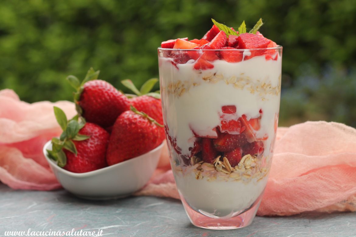 200 g di yogurt bianco o greco Pulite le fragole e tagliatele a dadini. Versate nel bicchiere: due cucchiai di yogurt, due cucchiai di fiocchi di avena, metà delle fragole e ancora lo yogurt, i fiocchi di avena e il resto delle fragole. Prima di gustarlo, potete versare un po' di miele sul porridge. Buon appetito!