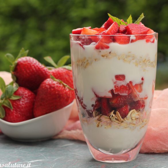 Overnight porridge con yogurt e fragole. E’ una colazione sana, semplice e gustosa. L’overnight porridge si prepara lasciando in ammollo i fiocchi di avena nello yogurt o nel latte per tutta la notte. Preparato con yogurt e frutta è saziante, ma al tempo stesso leggero. E’ inoltre versatile: ogni giorno potete cambiare un po’ gli ingredienti come la frutta, aggiungere nello yogurt i semi di chia, il miele o quando pronto cospargerlo con semi di girasole, frutta secca o con pezzi di cioccolato fondente. Mi piace tanto l’overnight porridge cosparso con la granola fatta a casa: la ricetta la trovate qui. Dei vantaggi del porridge vi ho invece scritto qui: Perché vale la pena mangiare il porridge.