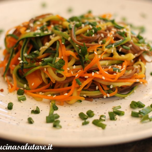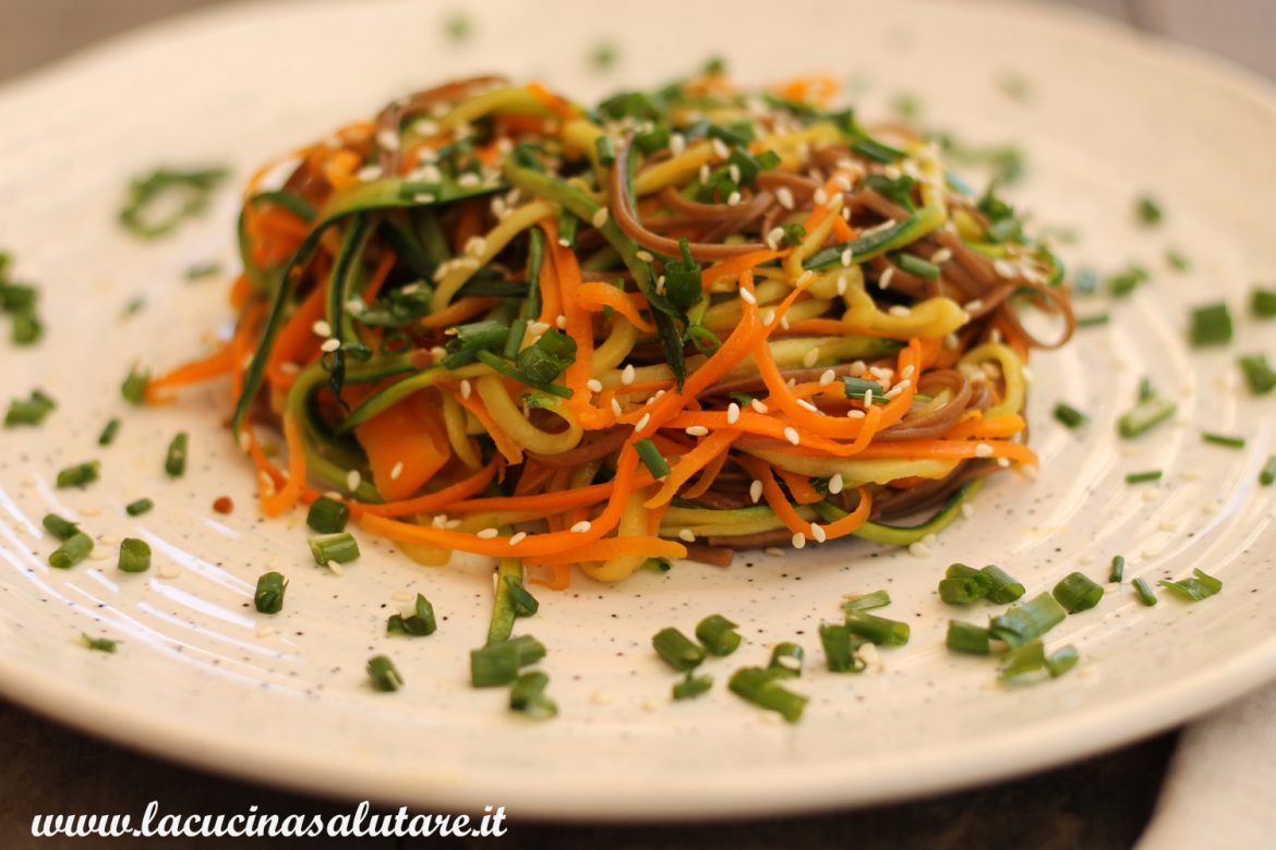 Soba con verdure croccanti. La soba è una pasta di grano saraceno, tipica della cucina giapponese. Viene mangiata sia calda sia fredda, perfetta quindi per preparare i vostri pranzi da consumare fuori casa. La potete acquistare nei supermercati dove si trovano i prodotti etnici, nei negozi orientali o molto spesso presso i supermercati Lidl durante le settimane asiatiche. La soba è veramente squisita, originale e molto versatile. Il tempo di cottura è molto breve (circa 3 minuti), il ché è molto utile quando non avete troppo tempo da dedicare alla cucina. Il piatto che vi propongo oggi lo potete preparare in pochi minuti per un pranzo leggero, sano e genuino. Provatelo perché è veramente buono.
