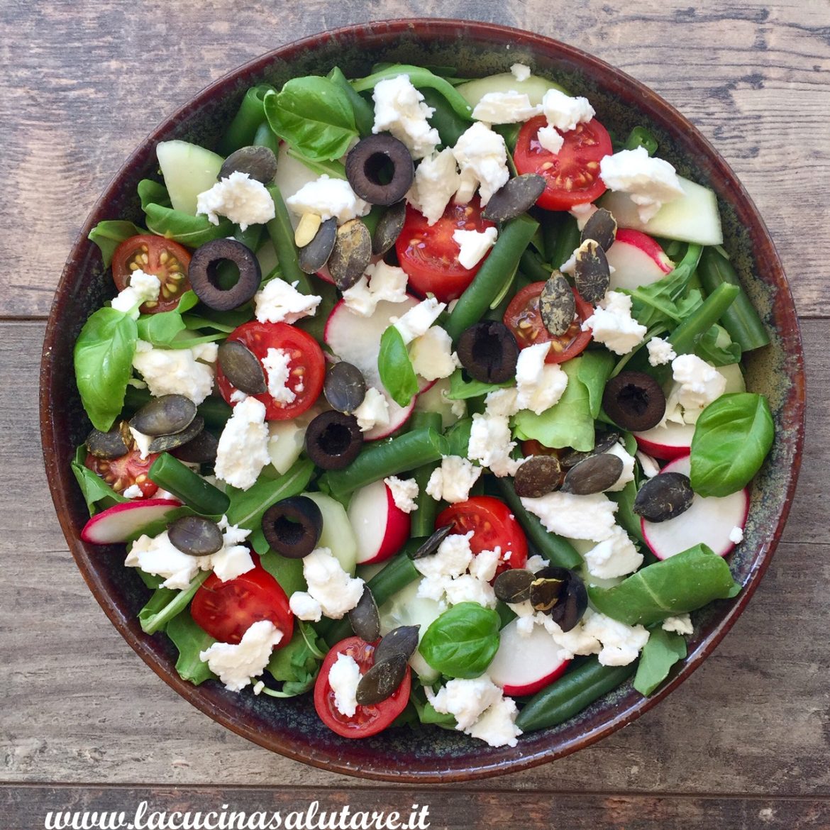 L’insalata di fagiolini e feta è una proposta come piatto estivo, ideale per pranzo o una cena leggera. Ho utilizzato i fagiolini cotti al vapore il giorno precedente che abbiamo mangiato per la cena. L’insalata è fresca, sfiziosa e ideale per affrontare il caldo estivo. Se la feta vi sembra troppo salata, la potete sostituire con il quartirolo, il caprino o la ricotta stagionata. Guardate anche la ricetta per insalata estiva con focaccine integrali .