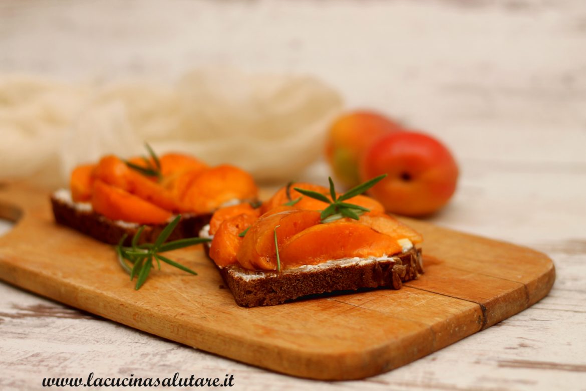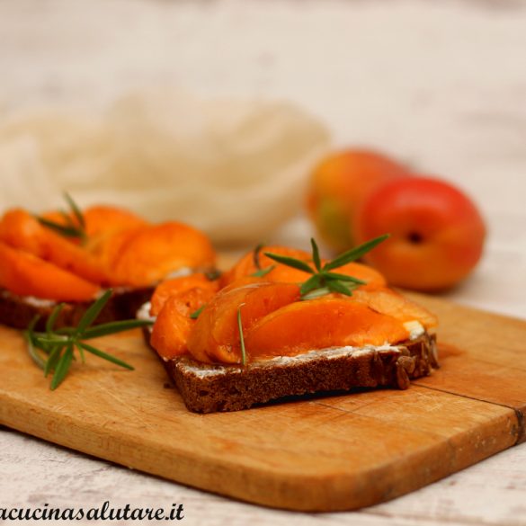 Oggi vi propongo una nuova idea per colazione: i toast con albicocche saltate con rosmarino. Sono sicura che vi innamorerete di questa colazione, perché ha un sapore appagante, diverso dal solito e ugualmente nutriente. Potete utilizzare il pane integrale come ho fatto io, oppure prepararli con il classico pancarré. Scegliete invece albicocche non troppo mature, è meglio utilizzare frutta abbastanza dura per questa ricetta. Vi assicuro che è molto semplice da preparare e richiede pochissimo tempo. Provatela! 2 fette di pane Lavate le albicocche, tagliatele a metà, eliminate i semi e affettatele. Su una padella riscaldate dell'olio, versate il rosmarino e i pezzi di albicocche. Saltate per 2 minuti e spegnete il fuoco.