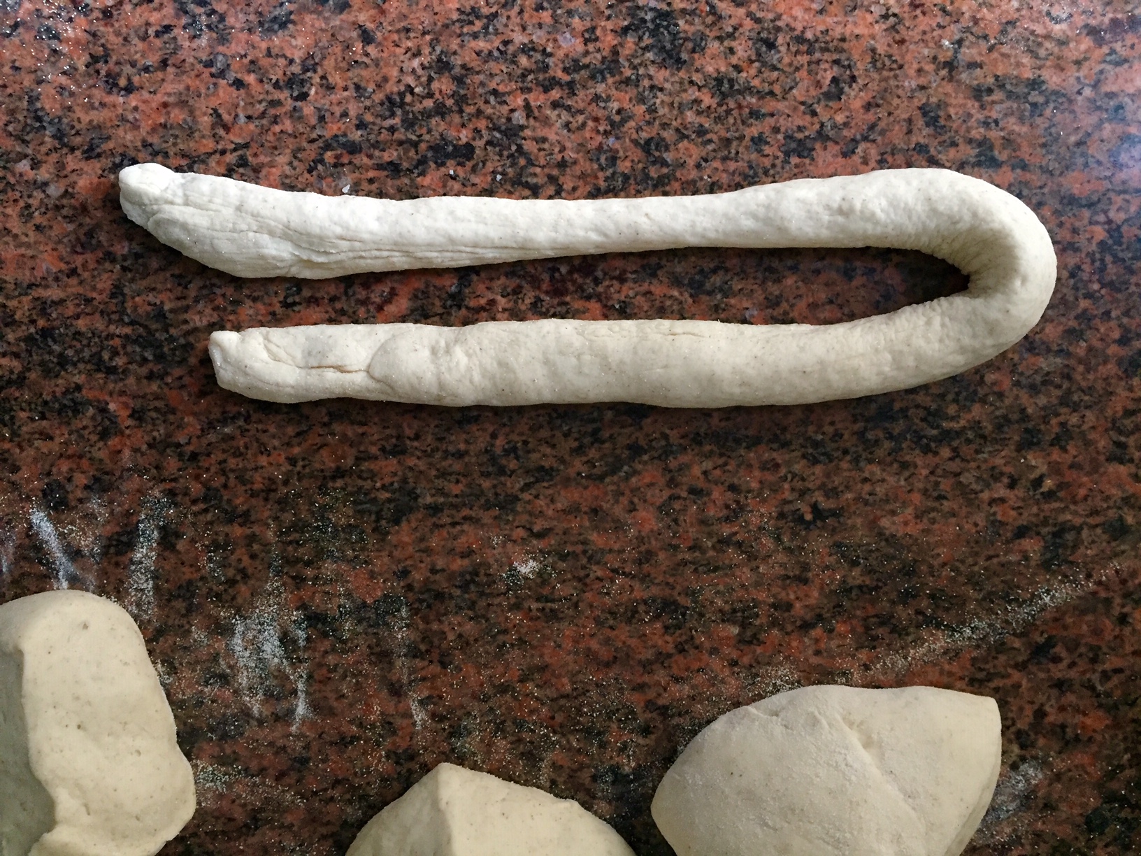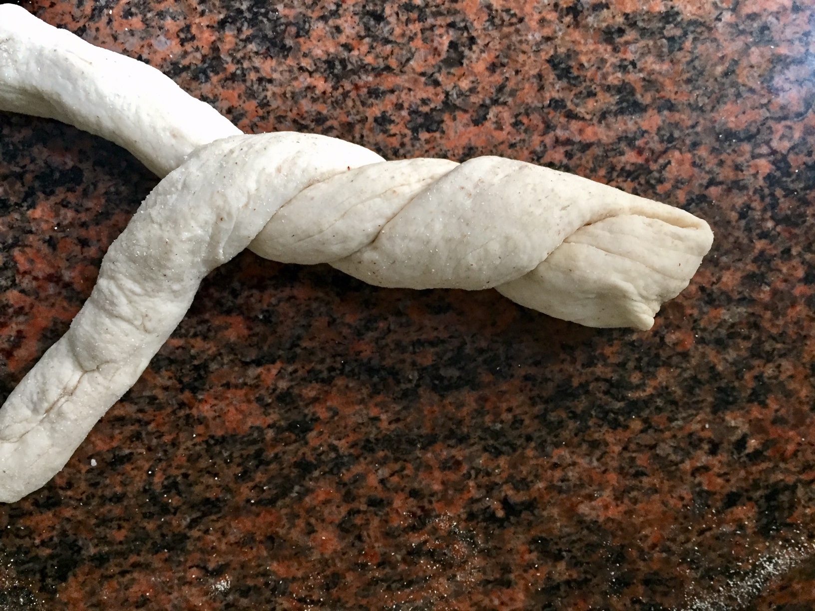 Dopo il tempo indicato mettete l'impasto sulla spianatoia, impastate brevemente e dividetelo in 8 pezzi uguali. Formate da ogni pallina dell'impasto un rotolo lungo e fine. Piegatelo a metà della sua lunghezza e fate una treccia come in foto: