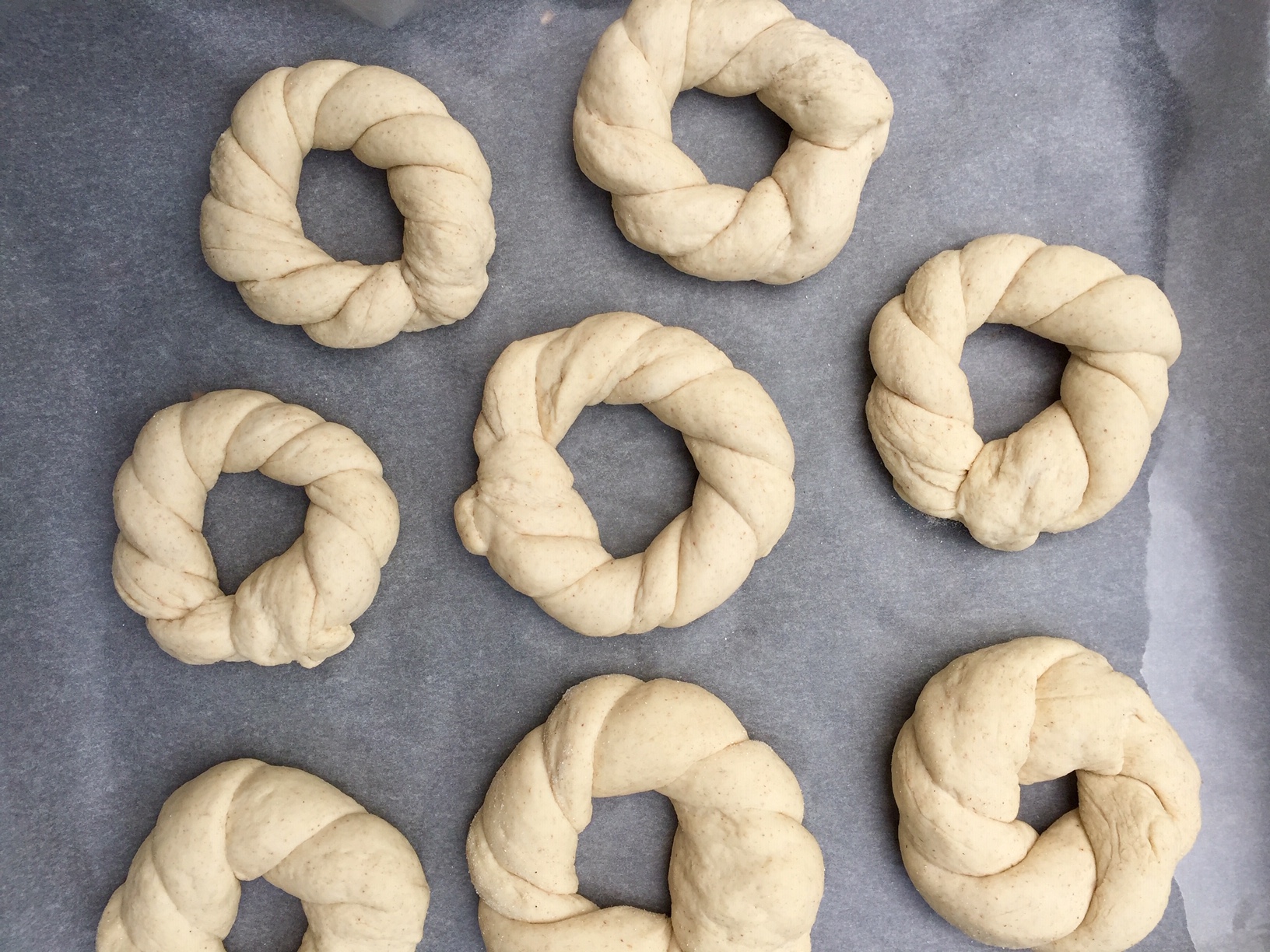 Unite le estremità formando i cerchi. Mettete i bagel su di una teglia rivestita con carta da forno, coprite ancora con uno straccio e lasciate lievitare per mezz'ora.