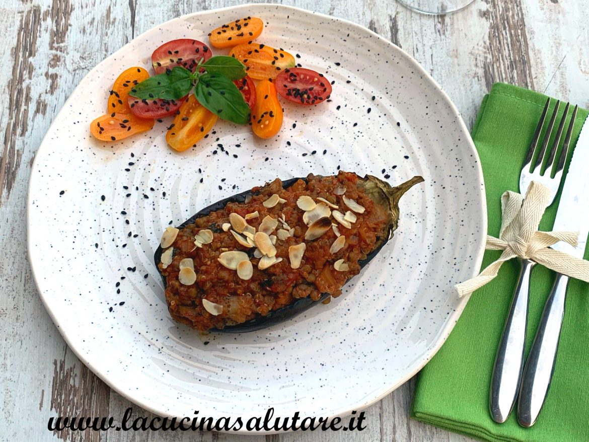 Le melanzane ripiene di lenticchie e quinoa sono una vera delizia autunnale. Il piatto è senza glutine né lattosio, vegano e veramente buono! Potete utilizzare la quinoa avanzata da altre preparazioni o sostituirla con couscous, miglio, orzo o riso. La ricetta è versatile ed ogni volta potete cambiare un po’ degli ingredienti aggiungendo i vostri preferiti. Buono, sano e nutriente. Guardate anche la ricetta per melanzane ripiene di lenticchie.