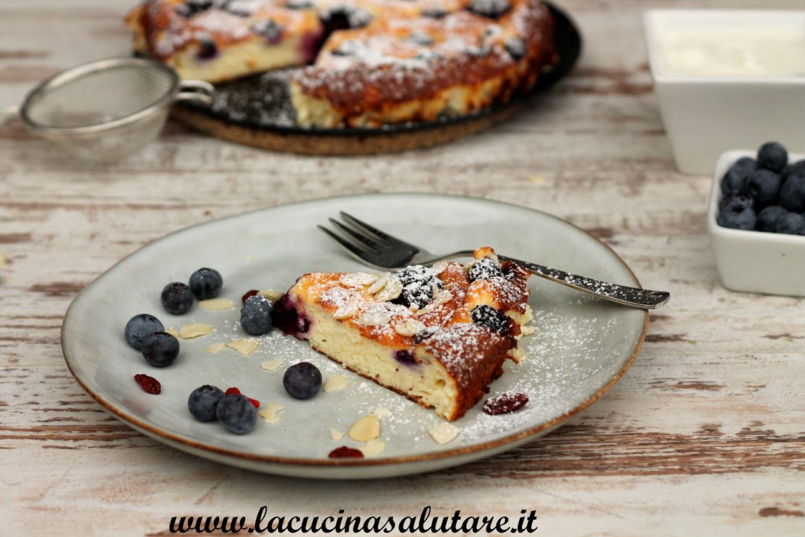 Omelette alla cheesecake fit al forno. La proposta per una colazione deliziosa e senza glutine oppure per una merenda. Questa omelette ha il sapore di una cheesecake e si prepara in pochi minuti. Potete servirla con yogurt greco, frutta fresca, miele o mangiarla senza nessuna aggiunta. Lo potete conservare in frigo per 2 giorni. Guardate anche la ricetta per omelette dolce con yogurt e frutta fatta in padella.