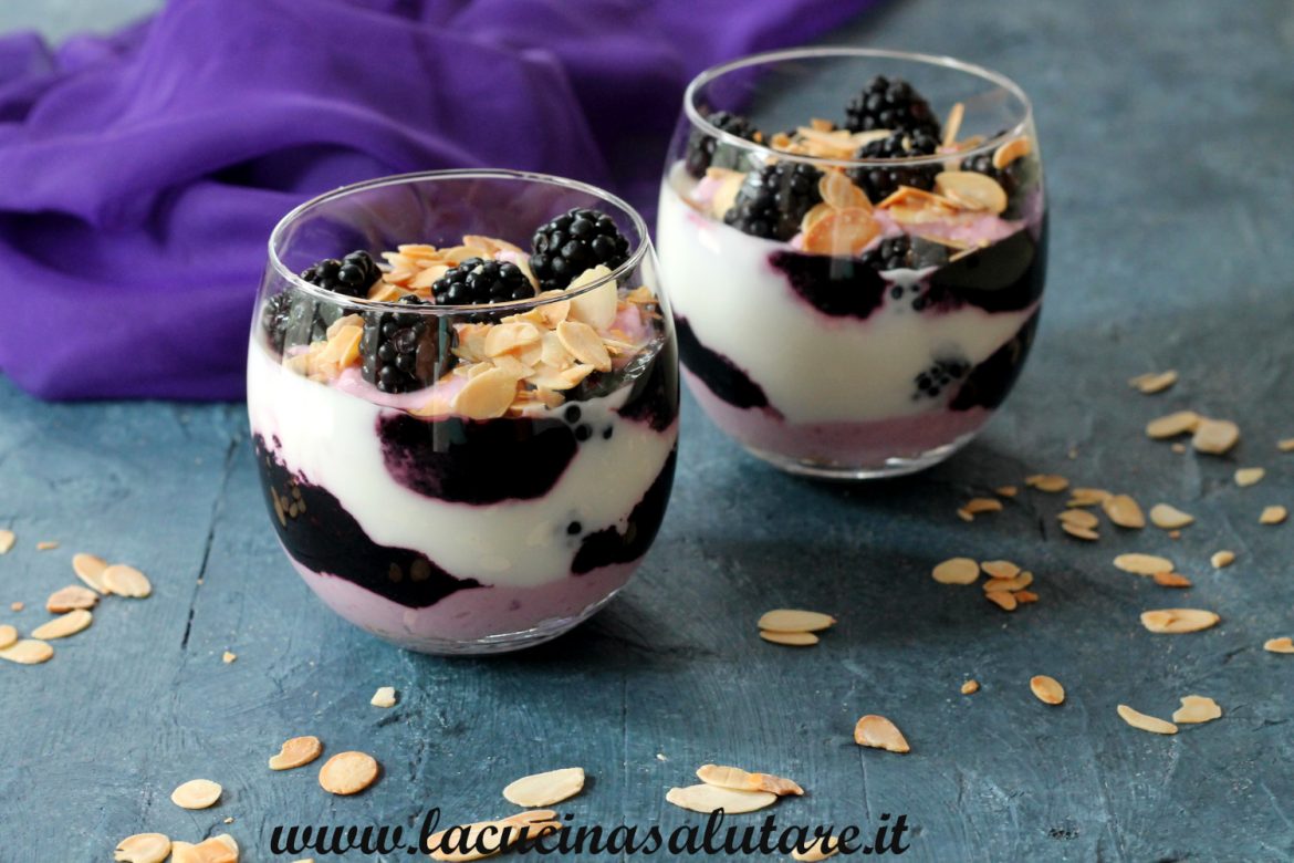 Versate nei bicchieri due cucchiai di fiocchi di avena, tre cucchiai di yogurt greco, due cucchiai di polpa, posate 2-3 more e versateci sopra lo yogurt bianco. Quindi versate ancora: due cucchiai di polpa di frutta, le more e per finire il resto dello yogurt greco. Decorate con la frutta e i fiocchi di mandorle tostate.