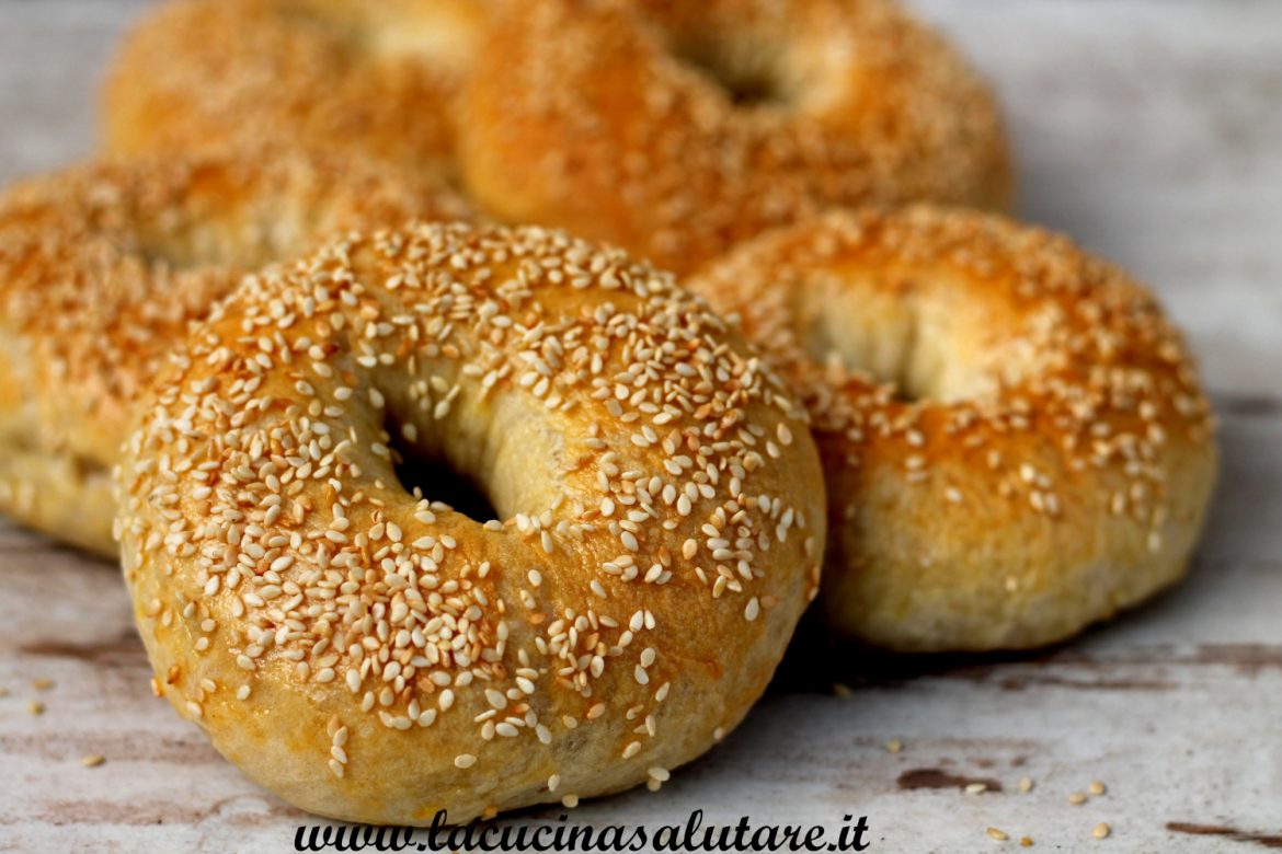 Bagel ai semi di sesamo. Mi sono innamorata completamente dei bagel durante il nostro ultimo viaggio in Polonia, a Cracovia. Li vendono ad ogni angolo e in ogni strada vicino al centro. Esistono di tanti tipi: con i semi di papavero, di sesamo, con sale, con i semi di girasole ecc. Sono buonissimi serviti con formaggio e confettura o anche con fette di prosciutto o di salmone affumicato, oppure mangiati senza alcun condimento. Il procedimento non è difficile, ma piuttosto lungo, dovete quindi riservare un po’ di tempo alla preparazione. Se invece non vi piacciono le ricette impegnative, guardate la ricetta semplice per i bagel qui. Un bagel contiene circa 180 kcal.