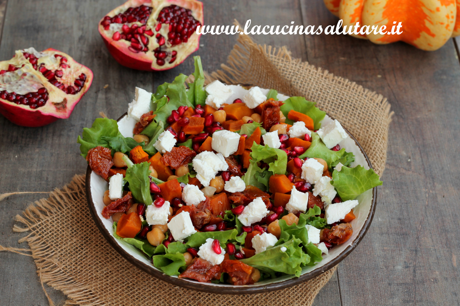 L’insalata di zucca, ceci e caprino è la mia proposta per una buonissima insalata autunnale che potete mettere nella vostra schiscetta e portare al lavoro. Potete sostituire il caprino con la feta o il quartirolo e aggiungere noci oppure semi di zucca o di girasole. L’insalata è sostanziosa, nutriente e veramente gustosa. Si può anche preparare la zucca al forno il giorno precedente e conservarla in frigo. Guardate la ricetta per Insalata di zucca, rucola e riso
