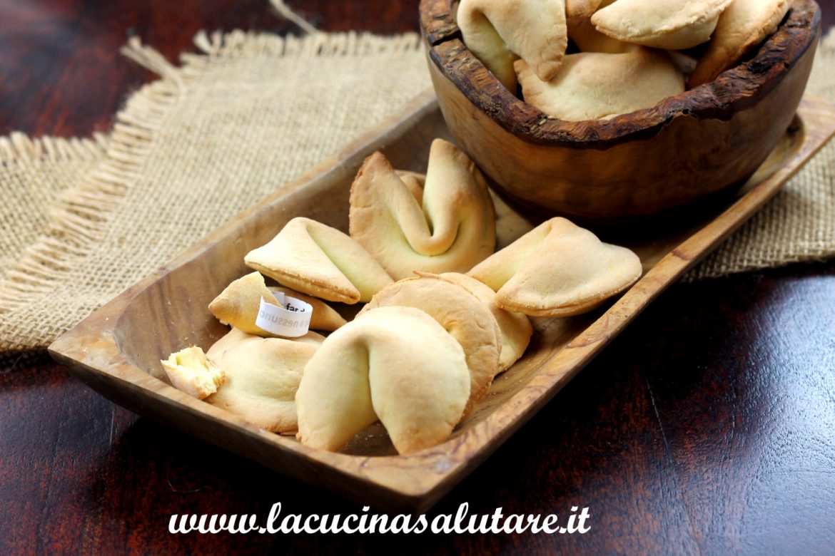 Biscotti della fortuna dolci a modo mio, ovvero senza burro. Siccome l’impasto non è grasso, non c’è il rischio che i vostri biglietti all’interno si possano rovinare. I biscotti sono delicatamente duri, non si rompono e piacciono praticamente a tutti. Le frasi da mettere dentro i dolci le abbiamo trovate su Internet cercando su Google: “frasi per i biscotti della fortuna”. Ne potete trovare parecchie, oppure sfogare la vostra fantasia, se avete intenzione di prepararli per una occasione speciale. Questa versione è piaciuta di più ai ragazzi (adolescenti) rispetto a quella meno dolce (la ricetta è qui), ma a dire il vero entrambe sono buone…