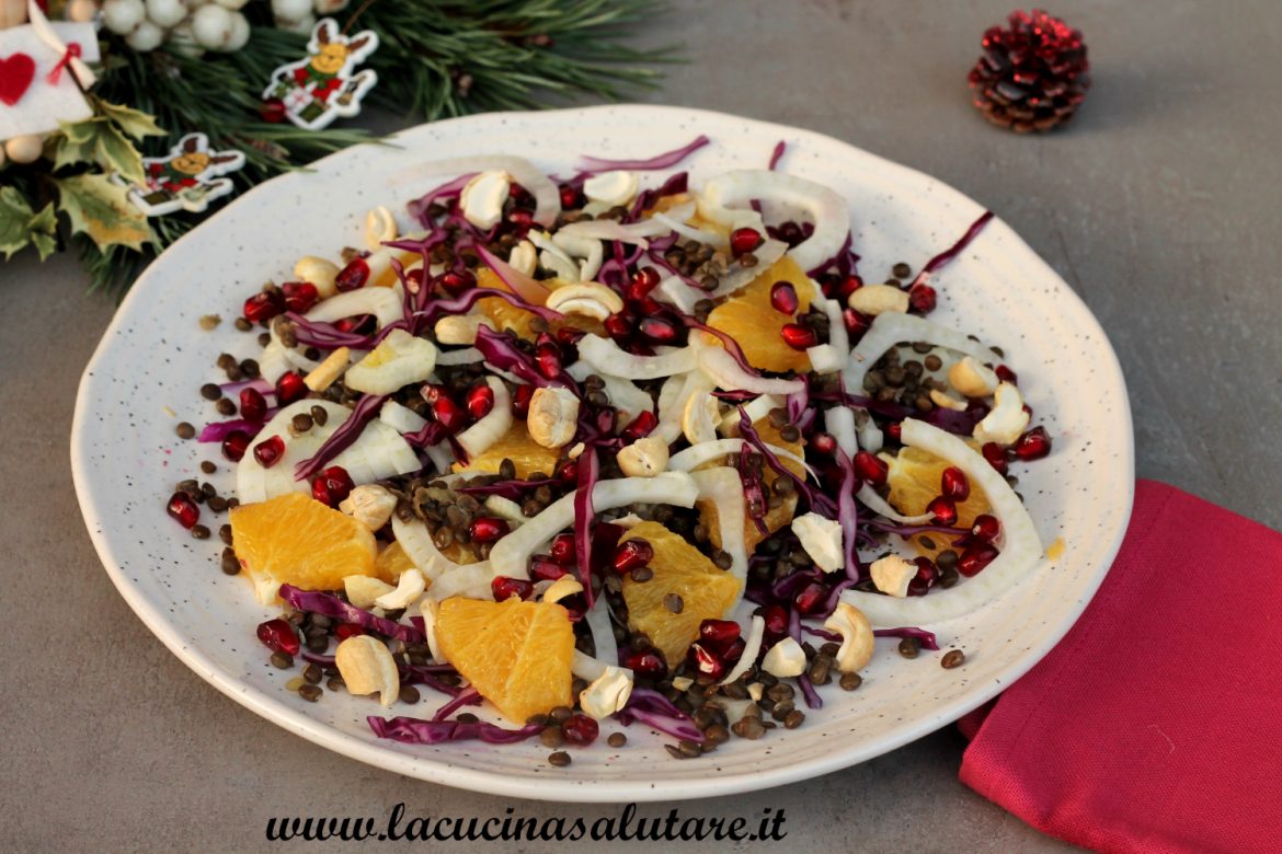 Insalata di lenticchie nere e cavolo rosso con finocchio, arancia, chicchi di melagrana e anacardi. E’ una proposta vegana, sana e nutriente non solo per le feste.