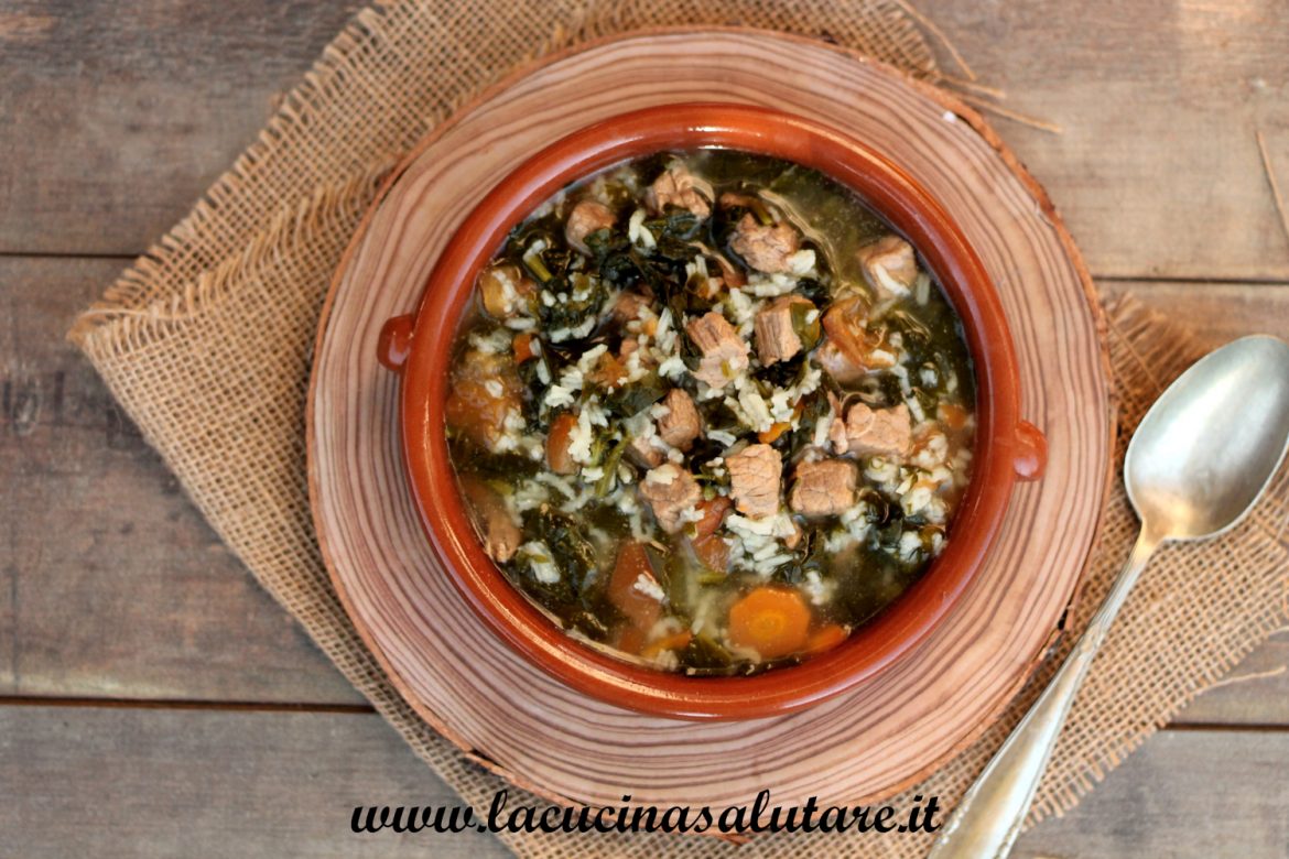 Zuppa di manzo e spinaci con riso condita con cannella. La zuppa ideale per l’inverno: sostanziosa e nutriente. Vi riscalda durante le giornate fredde. E’ un piatto unico per qualsiasi pasto, a pranzo come a cena, che inoltre potete congelare.