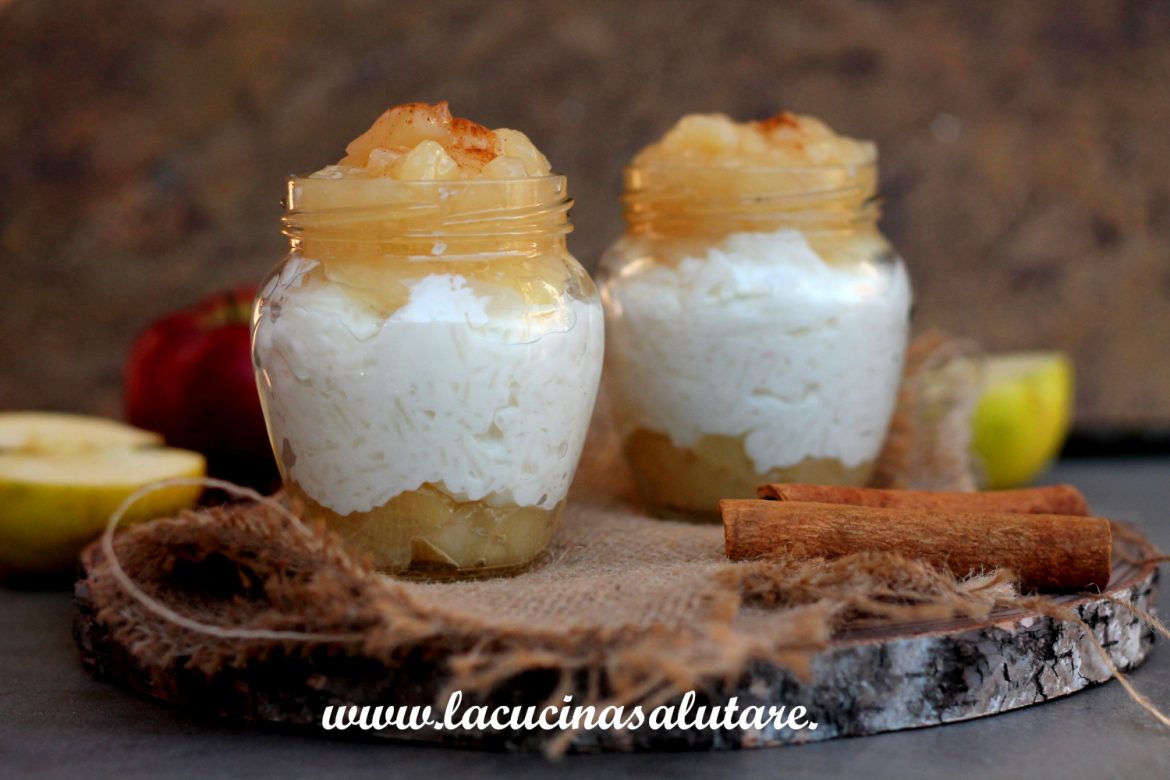 Per preparare la composta di mele, sbucciatele, eliminate il torsolo e tagliatele a cubetti. Versatele in una pentola, aggiungete 3-4 cucchiai di acqua e fate cuocerle a fuoco moderato per circa 30 minuti mescolando spesso. Se le vostre mele non sono succose, aggiungete ancora un po' di acqua. Una volta pronte, condite a piacere con zucchero e cannella. Passate quindi alla preparazione degli altri ingredienti, scaldando innanzitutto il latte, mettete quindi il riso in una pentola e versate mezza tazza di latte scaldato. Portatelo a ebollizione mescolando di tanto in tanto. Cuocetelo a fuoco basso per circa 25 minuti aggiungendo man mano il resto del latte, avendo cura che non si asciughi troppo. Il procedimento è uguale come per la cottura del risotto. Il riso deve avere una consistenza cremosa. Versate nei bicchieri la composta di mele, il risolatte e lasciateli raffreddare completamente.
