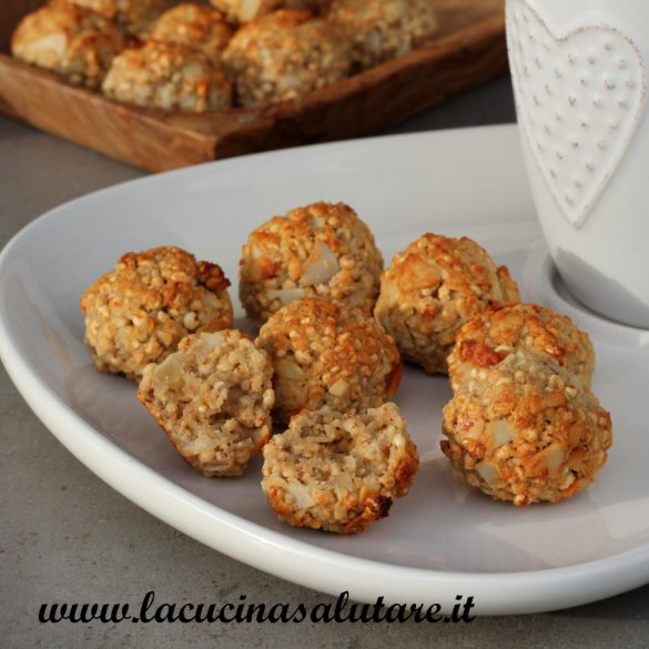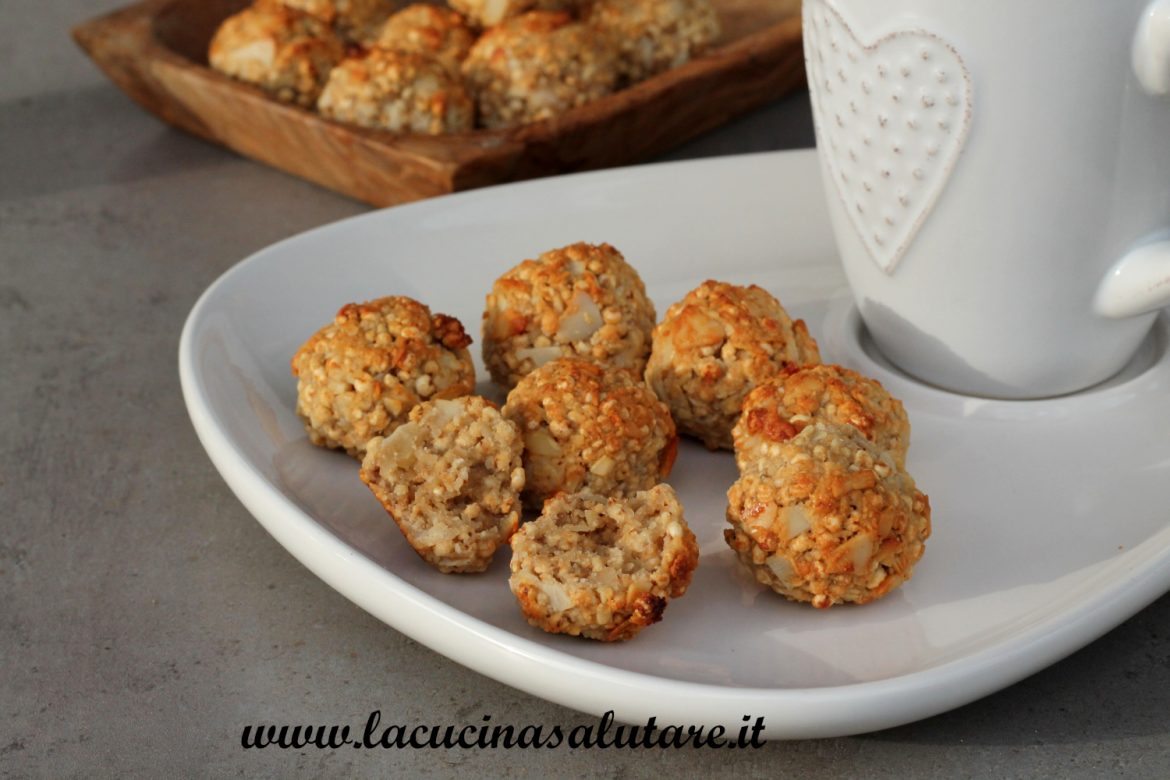 50 g di miglio soffiato Prendete una grande ciotola, unitevi al suo interno tutti gli ingredienti. Mescolate tutto molto bene con un cucchiaio. Con le mani bagnate formate dalla pasta delle palline delle dimensioni di noci, mettetele su di uno stampo rivestito con carta da forno e infornate a 180 gradi per 10-12 minuti, quindi lasciate raffreddare completamente.
