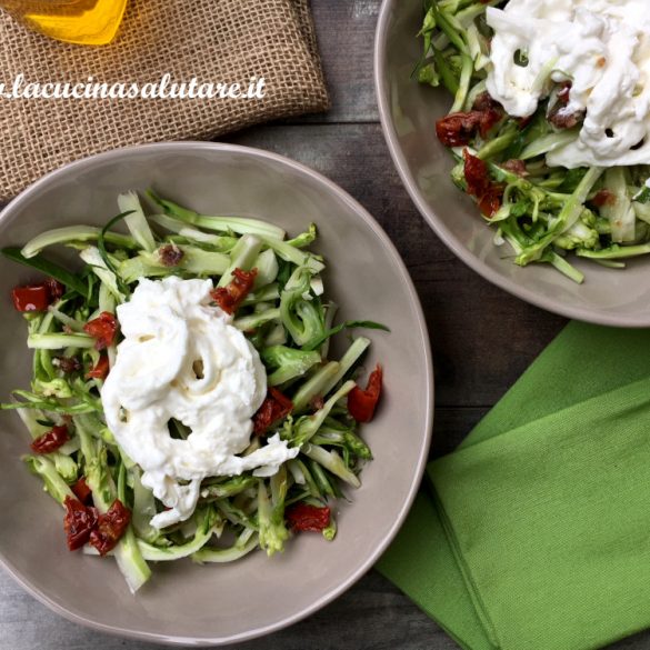 L’insalata di puntarelle e stracciatella è una proposta per un piatto sfizioso, estremamente gustoso e nutriente. Le puntarelle hanno un basso contenuto calorico e mangiate crude presentano proprietà purificanti e disintossicanti per l’organismo. Con la cremosità della stracciatella creano una composizione davvero strepitosa, ma la potete sostituire con la mozzarella di bufala. Guardate anche la ricetta per Insalata di punterelle e carciofi