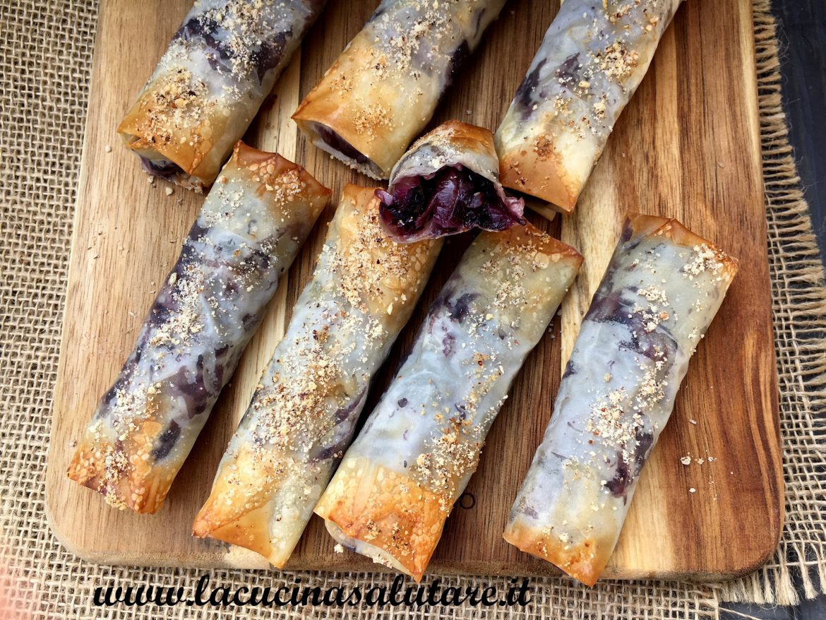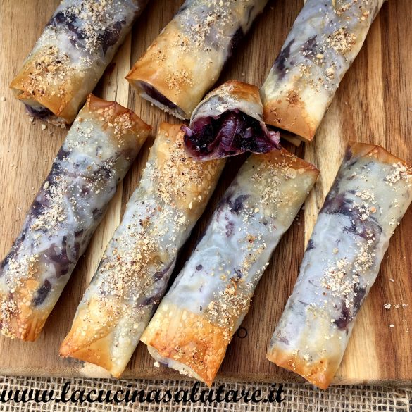 Involtini di pasta fillo con radicchio e taleggio. Buonissimo finger food che potete mangiare come antipasto, oppure come noi, per un pranzo leggero e genuino. La pasta fillo è prodotta senza aggiunta di grassi, a differenza delle comuni paste sfoglia, e quindi non vi appesantisce. Gli involtini sono facili da preparare, croccanti e davvero molto gustosi. Guardate anche la ricetta per Involtini di pasta fillo con verdure