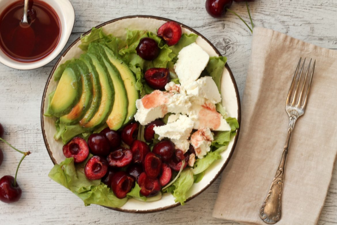 Mettete l’insalata sul piatto e aggiungete le ciliegie, la ricotta e l’avocado.