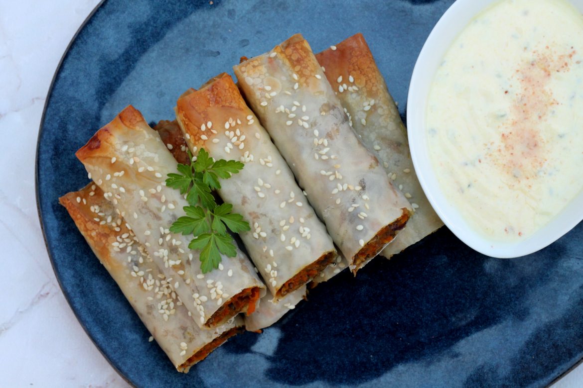 Involtini di pasta fillo con lenticchie, servita con salsa allo yogurt. Una ricetta vegetariana che potete modificare senza problemi rendendola una ricetta vegana. Semplici da realizzare e nutrienti, li potete servire come piatto unico, per esempio per pranzo. Sono buoni, ma sinceramente la nostra ricetta preferita per gli involtini di pasta fillo è sempre questa: Involtini di pasta filo con verdure.