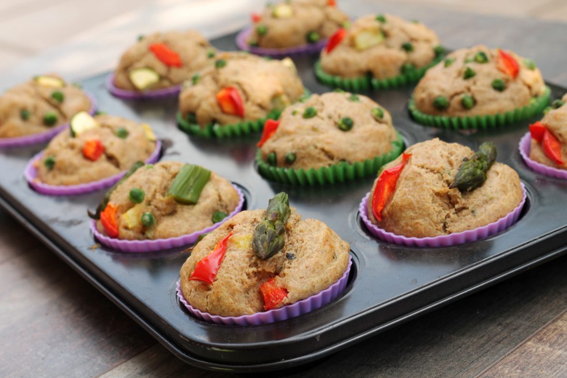 Muffin salati integrali con verdure primaverili. Ideali come antipasto, aperitivo o merenda salata. Potete anche prepararli con formaggio o pezzi di prosciutto e metterli nella vostra schiscetta per la pausa pranzo al lavoro o per uno spuntino.