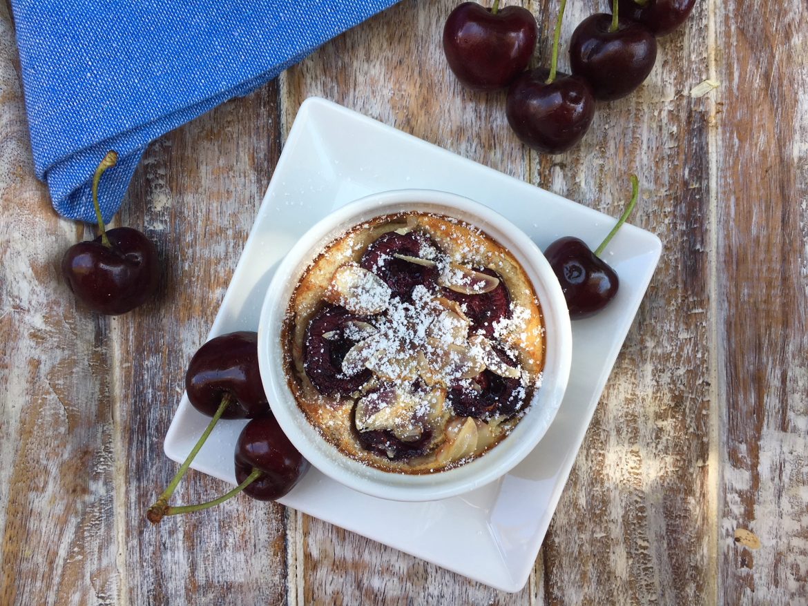 Clafoutis di ciliegie al sapore di mandorle, nella mia variante monodose per una buonissima colazione o una merenda. Il clafoutis si prepara con la frutta di stagione e si gusta tiepido. Molto semplice da preparare e sono sicura che vi stupirà con il suo sapore. Può essere realizzato con qualsiasi altra frutta.
