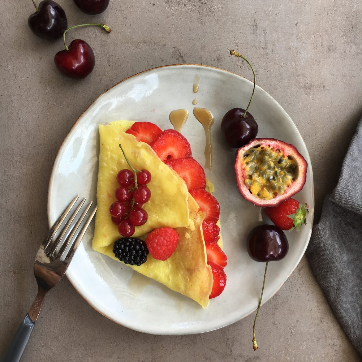 Frullate in una ciotola il latte di cocco con l'uovo, la curcuma e la farina di riso. Se il composto risulta denso, aggiungete un po' d'acqua. Dovete ottenere un impasto della consistenza come per le crespelle tradizionali. Lasciatelo poi riposare per 10 minuti. Riscaldate bene una padella antiaderente su fuoco medio e spalmatela con poco olio, versate un mestolo di composto e friggete per pochi minuti su ambo i lati. Servite con la frutta fresca e lo sciroppo di acero (oppure il miele).