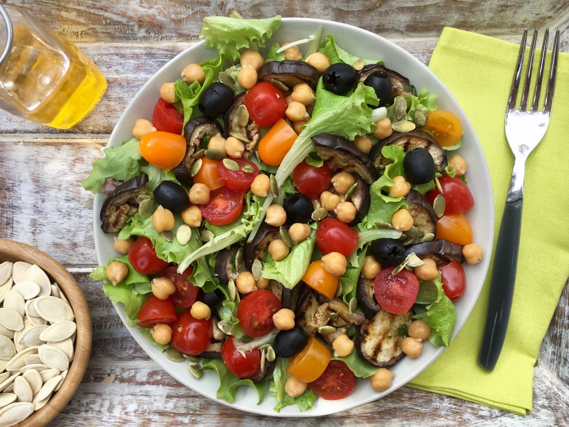 Lavate la melanzana e tagliatela a fette spesse 3-4 mm, mettetele su un tagliere e cospargetele con un po' di sale. Lasciate spurgare l'acqua per 20 minuti, asciugatele con la carta da cucina e grigliatele in padella. Tagliate i pomodorini a metà. Mettete il lattughino alla base della vostra insalata in un piatto, ponete poi sopra le fette di melanzana, i pomodorini, le olive, i ceci e i semi di zucca. Condite infine con la salsa francese prima di gustarla.