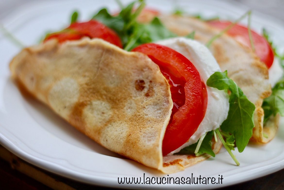 Crespelle alla caprese. Una semplicissima proposta per un pranzo estivo leggero e gustoso. Potete mangiarle fredde o tiepide, aggiungendo magari un po’ di pesto alla genovese. Guardate anche la ricetta per Crespelle integrali con verdure grigliate e Crespelle di barbabietola con quartirolo e rucola.