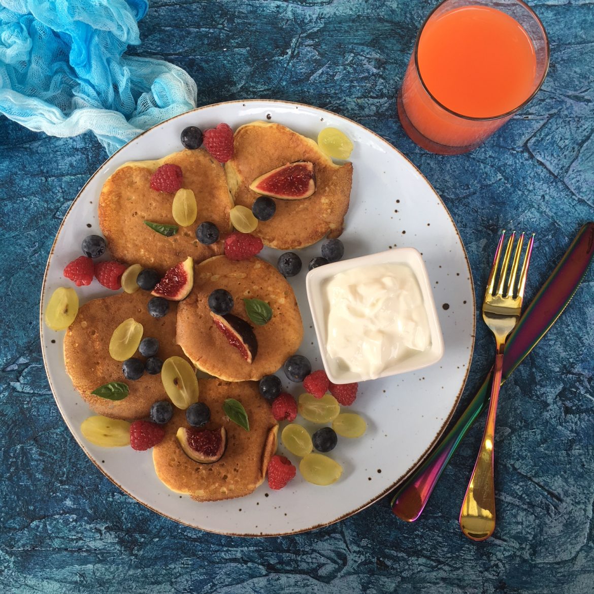 Pancakes allo Skyr. Buonissimi, delicati, con un alto contenuto di proteine. Saranno ideali per la vostra colazione durante il weekend. Potete preparali in pochi minuti, senza sbattitore o frullatore. Ideali serviti con frutta fresca, miele o sciroppo d’acero. Assolutamente da provare! 1 porzione contiene circa: 230 kcal, P:19, C:19, G:6. Guardate anche la ricetta per Pancakes fit e light e Pancakes d’avena e mele