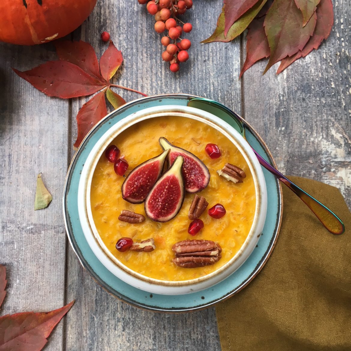 Porridge alla zucca. Un buonissimo porridge con la polpa di zucca e le spezie: curcuma, cardamomo, cannella e zenzero. Ideale per i periodi autunnale e invernale. Vi riscalda durante le mattine fredde e vi da un bel carico di energia. Potete aggiungere la vostra frutta fresca preferita e della frutta secca.
