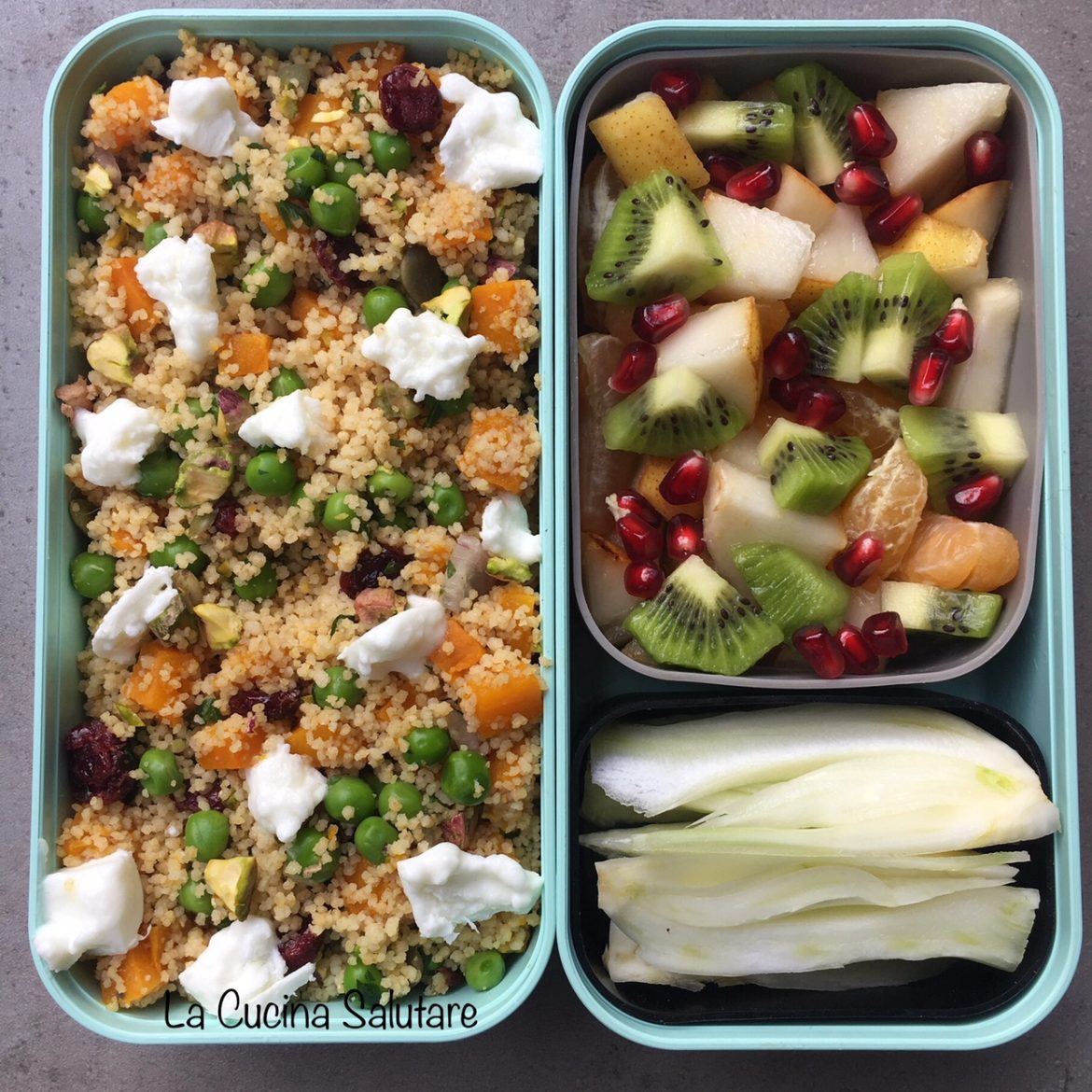 Schiscetta perfetta: couscous con zucca al forno e pistacchi, con l’aggiunta di piselli lessati, mirtilli essiccati, semi di zucca e pezzetti di mozzarella di bufala. E’ un pasto completo, decisamente ricco di sapori che ben si accostano tra loro; è ideale da portare in ufficio per la vostra pausa pranzo, ma non solo: potete tranquillamente servirla per il vostro pranzo quotidiano a casa. Al posto della mozzarella potete utilizzare caprino, ricotta salata, pecorino fresco o feta. Il couscous lo potete sostituire con qualsiasi altro cereale come quinoa, orzo, farro, grano saraceno ecc.. La mia schiscetta l’ho accompagnata con una macedonia e pezzi di finocchio bagnati con limone. Le nostre proposte con le ricette le trovate sul nostro libro qui