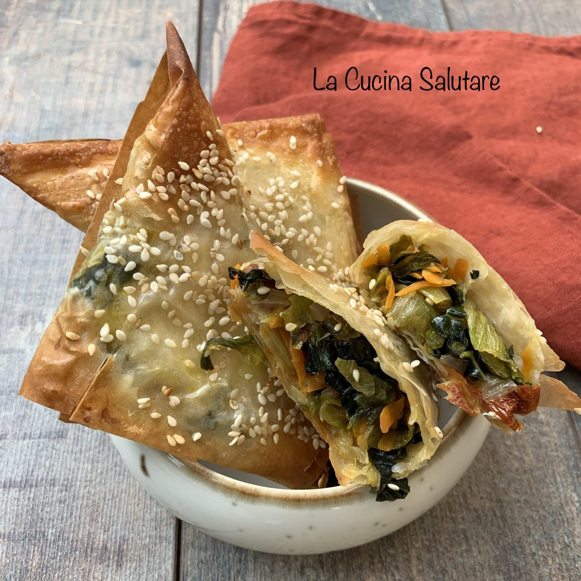 Lavate la scarola e le foglie di cavolo nero, asciugatele e tagliatele a strisce. Pulite e affettate la cipolla, sbucciate la carote e grattugiatela con una grattugia dai fori grandi. Tagliate a pezzetti i pomodori secchi. In una padella riscaldate l'olio e mettete la cipolla, friggetela per un minuto e aggiungete la carota grattugiata e il cavolo nero. Soffriggete ancora per un minuto, dopodiché metteteci la scarola, i pezzetti di pomodori secchi e le olive taggiasche. Stufate per circa 5 minuti mescolando di tanto in tanto. Una volta pronte, condite le verdure con sale e pepe e lasciate raffreddare. Tagliate i fogli di pasta fillo in 3 strisce per il senso della lunghezza. Spennellate con il latte e poi mettete il ripieno sull'angolo di ogni striscia e piegate l'impasto formando un ulteriore triangolo. Quando tutti i triangoli sono pronti, metteteli su di una teglia da forno, spennellateli ancora con il latte e cospargeteli con i semi di sesamo. Cucinate in forno preriscaldato a 190 gradi per circa 12-15 minuti.