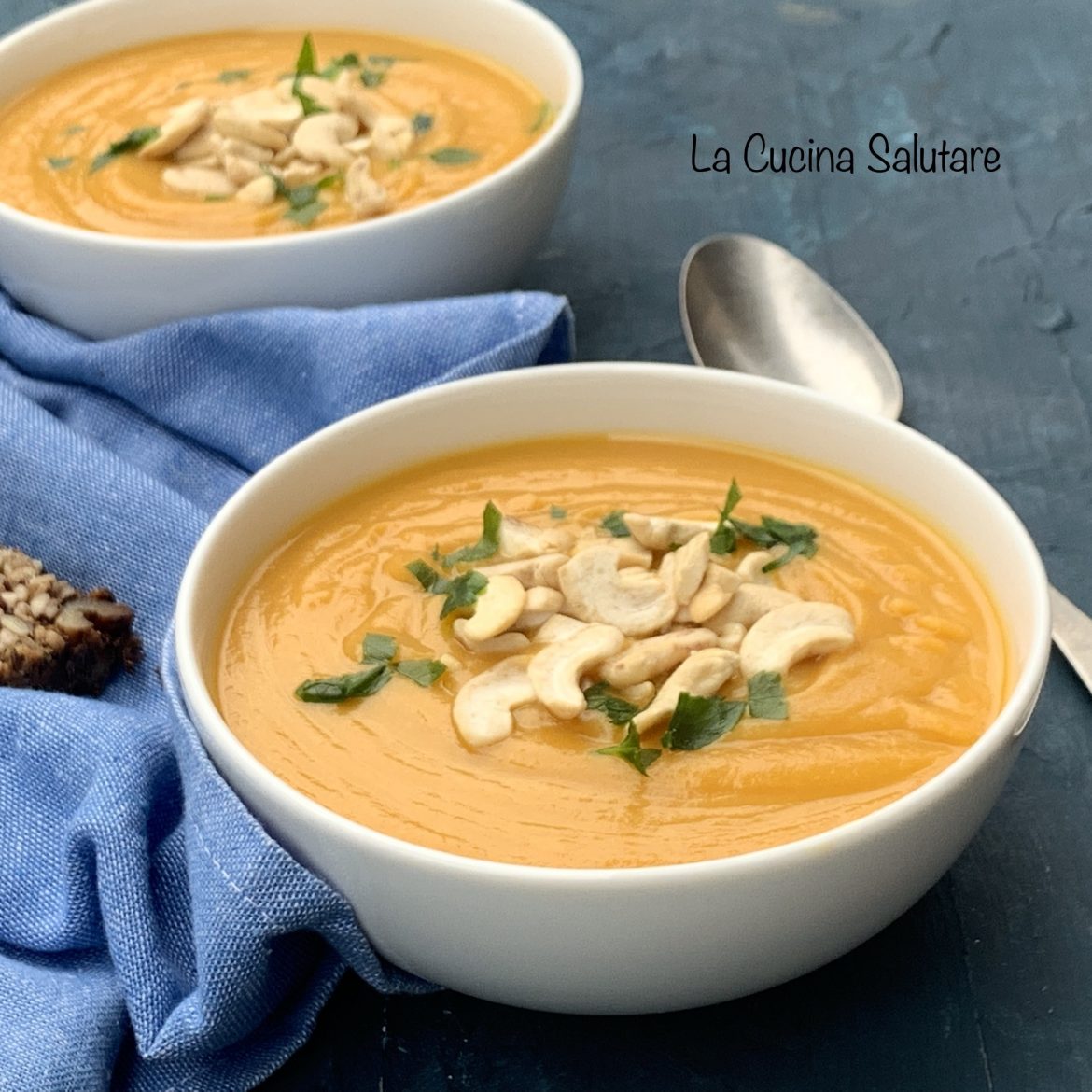 Buonissima vellutata di carote e lenticchie rosse condita con curry e curcuma che vi riscalda durante questi giorni freddi. E’ facilissima e veloce da preparare, sana, nutriente e golosa. Potete servirla come me con anacardi oppure con diversi semi o con crostini. La vellutata è sostanziosa, nutriente e aromatica, ideale per una cena leggera e appagante.