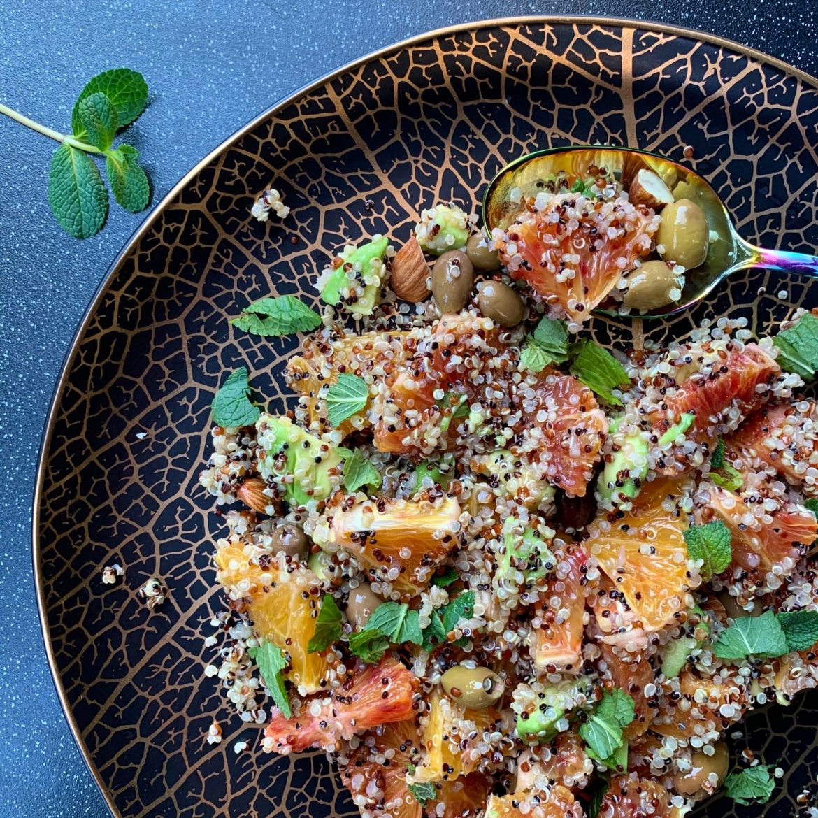 Insalata di quinoa e arance con l’aggiunta di avocado, olive taggiasche e mandorle. Fresca, leggera, nutriente e veramente deliziosa. Per ottenere un piatto più sostanzioso, potete aggiungere feta, caprino oppure tofu. Questa insalata è perfetta come piatto svuotafrigo, quando vi avanzano i cereali, da mettere nella vostra schiscetta e mangiare in ufficio durante la pausa pranzo. La quinoa è uno pseudocereale particolarmente dotato di proprietà nutritive, facilmente dirigibile e a basso contenuto calorico. E’ una preziosa fonte di proteine e di fibre priva di glutine. Prima di cuocere la quinoa, ricordate di sciacquarla accuratamente sotto l’acqua corrente. La quinoa si cucina in acqua leggermente salata con un rapporto di 1:2 (per ogni parte di quinoa servono 2 parti di acqua). Il tempo di cottura è di 12-15 minuti, fino a quando tutta l’acqua sarà completamente assorbita. Guardate anche la ricetta per Insalata di quinoa con pollo.